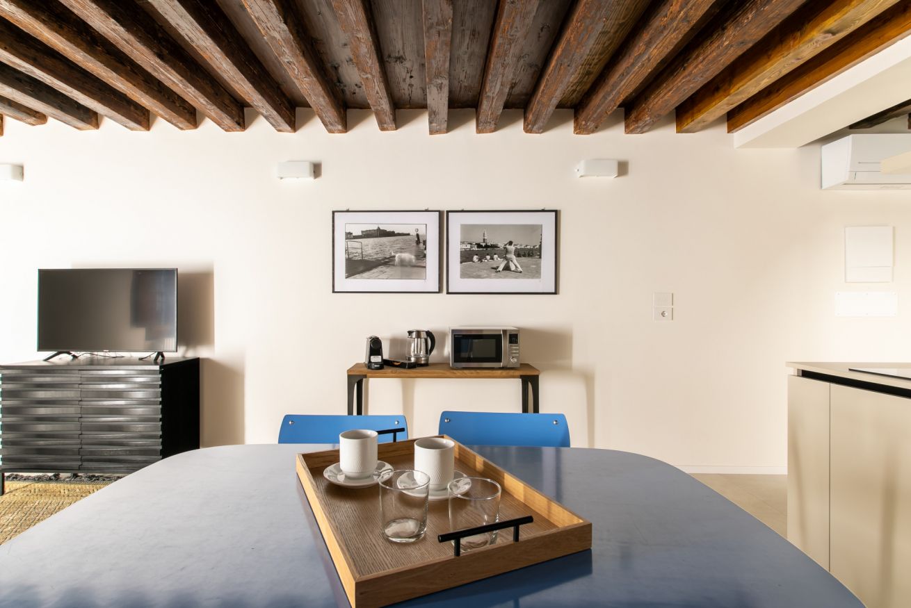Situato a San Polo, il sestiere del Ponte di Rialto, l'appartamento POP 1970 è al piano terra e dispone di 1 camera da letto. Cucina dotata di fornelli a induzione, frigo, tutto l'occorrente per cucinare e lavastoviglie, un bagno con doccia, lavatrice. Casa climatizzata con Wifi super veloce. Gli arredi del reparto giorno sono nei tre colori primari: quadro rosso, divano giallo e tavolo in formica azzurro. La foto in bianco e nero completa l'atmosfera vivace e chiassosa degli anni della rivoluzione culturale. Benvenuti nell'appartamento POP 1970.