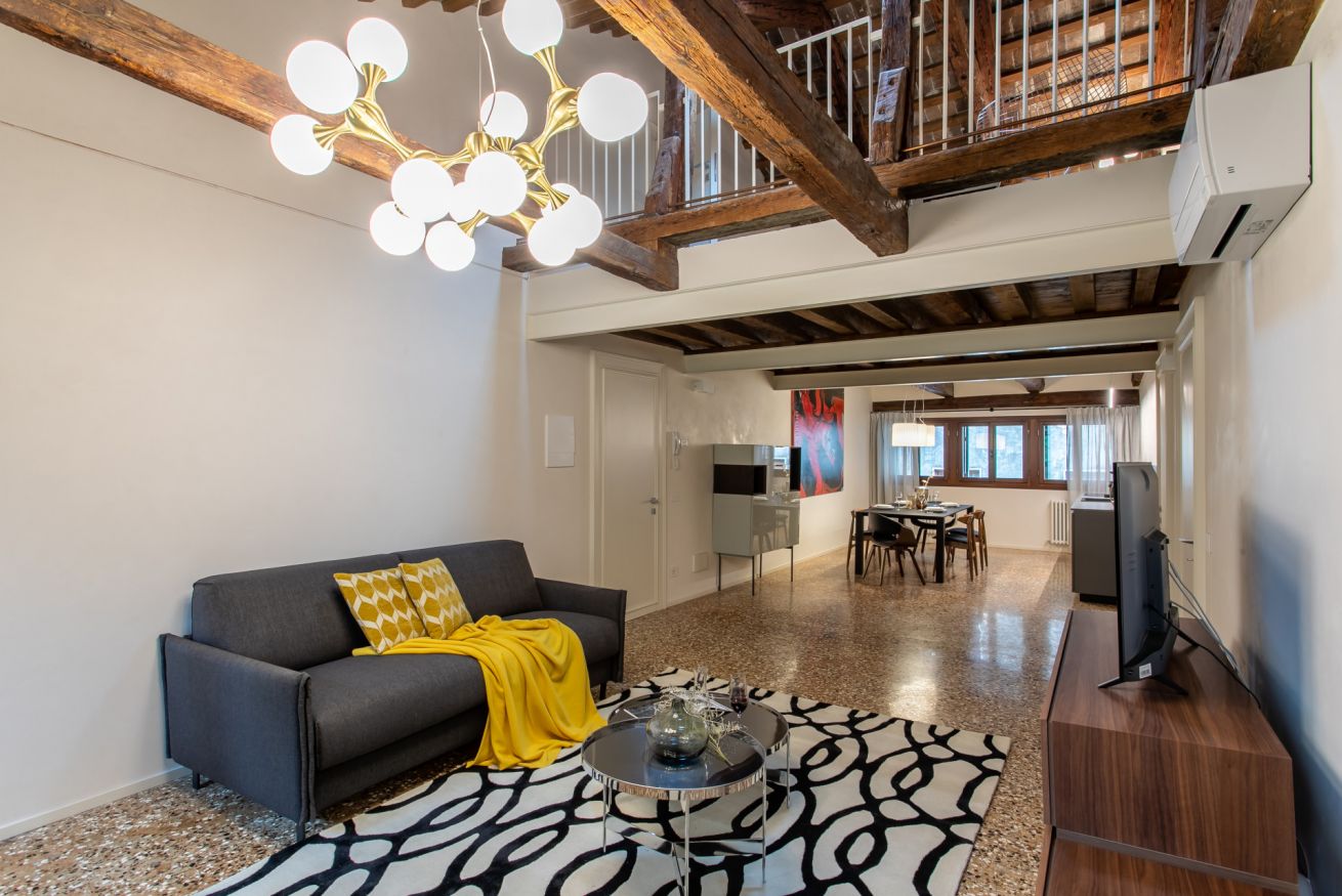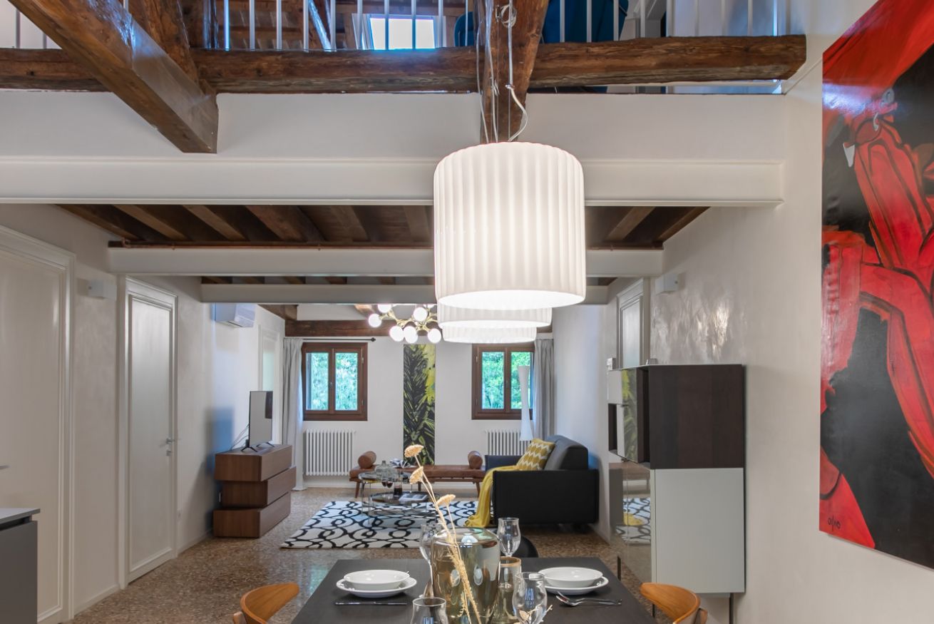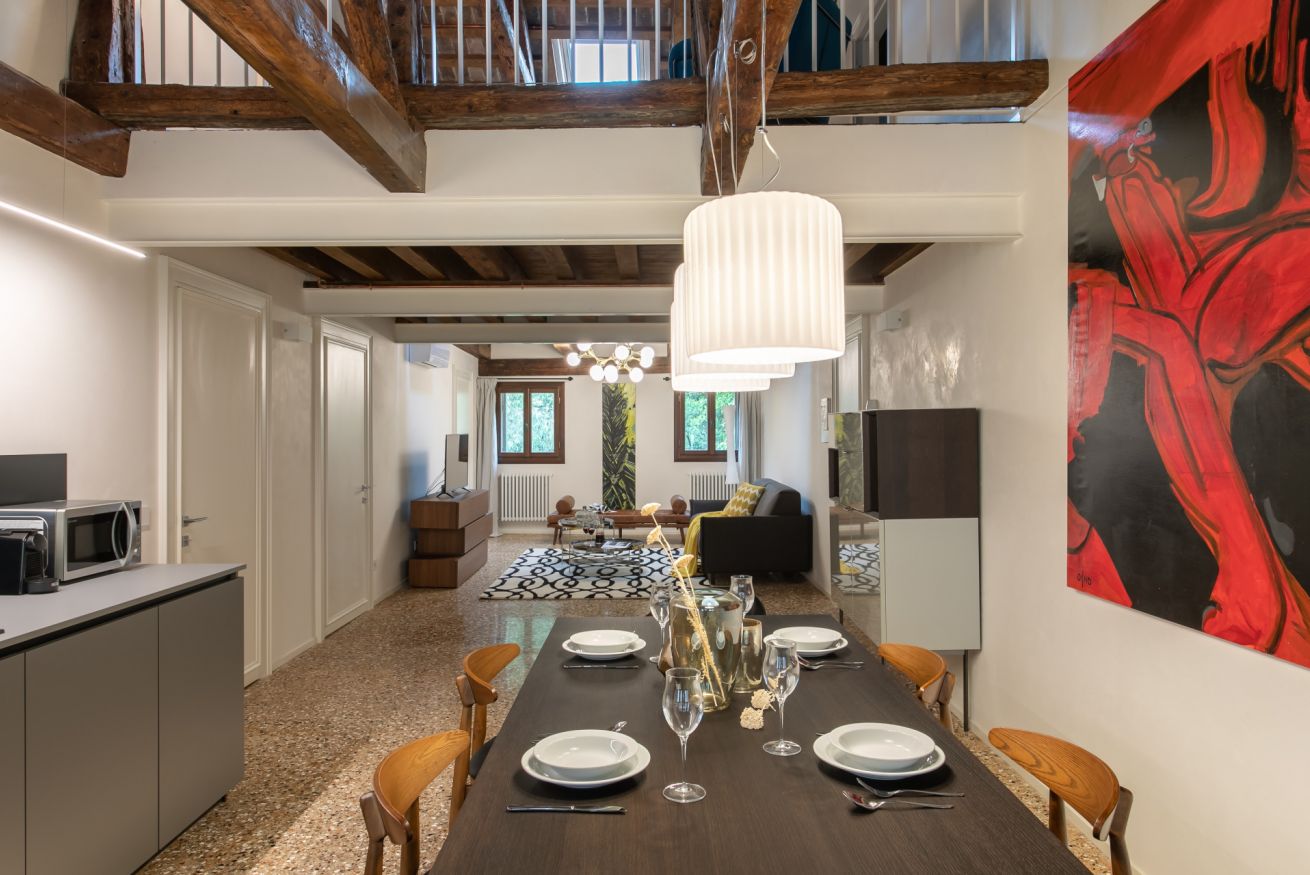 Situato a San Polo, il sestiere del Ponte di Rialto, ampio appartamento su due livelli, situato al secondo piano. Dispone di due spaziose camere da letto matrimoniali, di sala da pranzo con cucina completa di lavastoviglie, microonde e tutto l’occorrente per cucinare, di un elegante soggiorno con divano letto. Salendo le scale, si raggiungono il soppalco e la mansarda con due poltrone letto. La casa dispone di due bagni con doccia e una lavatrice. Infine, a disposizione Wifi super veloce e climatizzatore. L'ampio spazio di cui dispone questo appartamento lo rende arioso; le travi a vista lo rendono molto accogliente. Delle belle finestre quadrate si affacciano sul canale (il rio di San Zuane) e sulla calle. Nel grande soppalco travato con affaccio sul reparto giorno, la scrivania con macchina da scrivere e le poltroncine di un rilassante angolo lettura. Benvenuti nell'appartamento Scrittore.